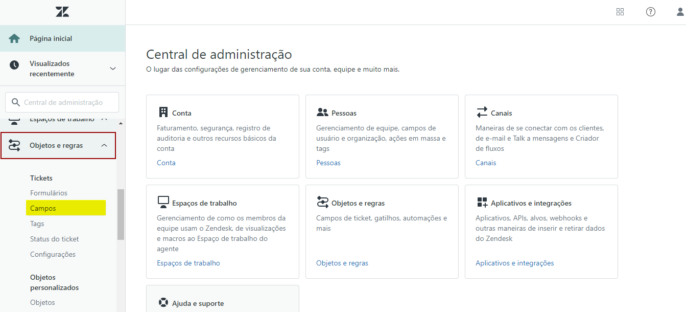 A criação de campos personalizados tickets é feita na Central de administração. O processo é simples e prático, conforme descrito no passo a passo: