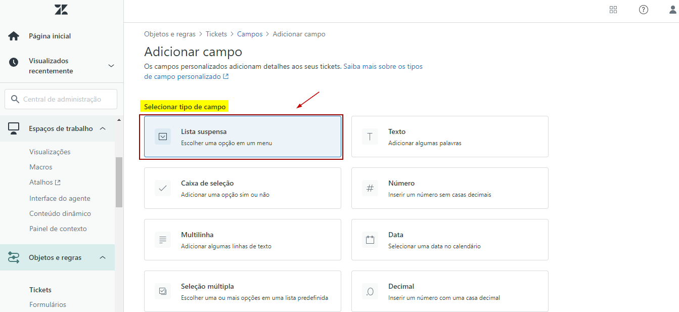 4) Selecione o tipo de campo clicando sobre uma das opções disponíveis. No exemplo abaixo foi utilizada a opção Lista Suspensa.