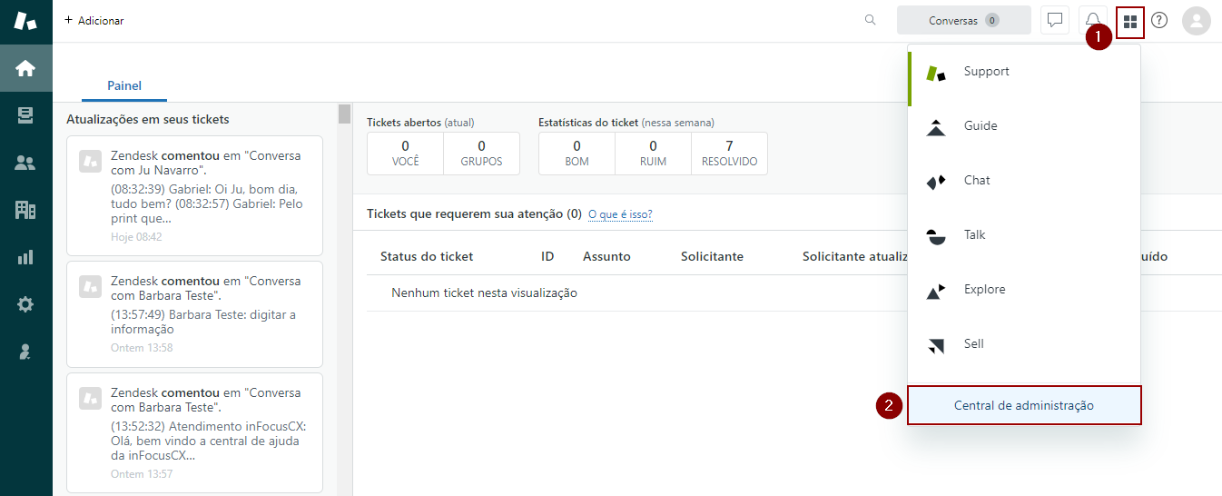 1) Na interface da Zendesk, acesse a Guia de Produtos Zendesk e selecione Central de administração.