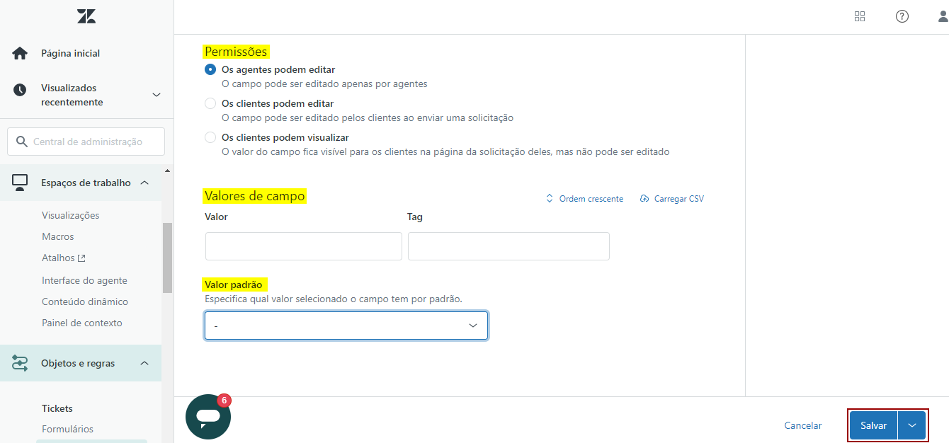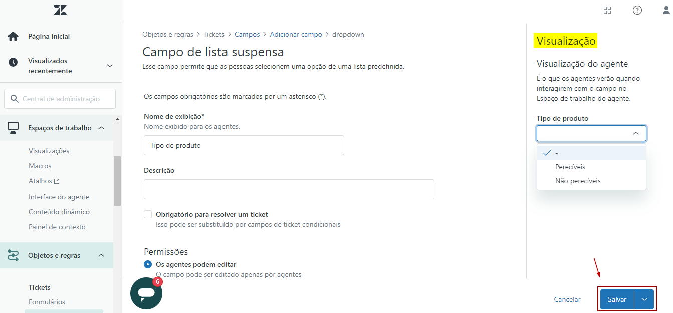 7) Em Visualização será possível ter uma prévia de como os agentes verão as configurações criadas no ticket. Clique em Salvar.