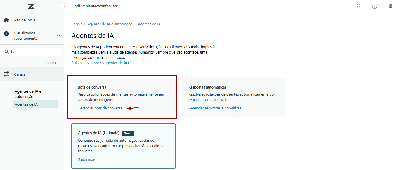 4) No menu Agentes de IA, selecione a opção Bots de Conversa > Gerenciar bots de conversa.