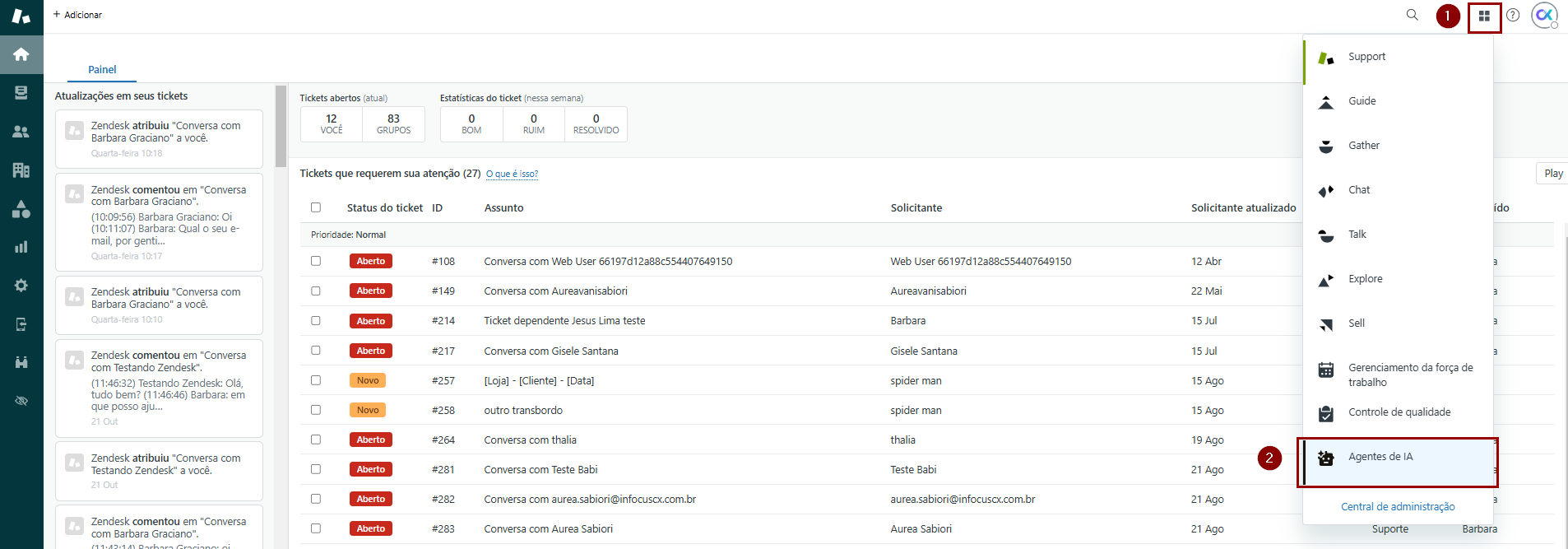 1) Existem duas formas de se iniciar o acesso ao menu de configuração do fluxo de conversa no Bot. A primeira consiste em acessar o menu de produtos Zendesk (1) e selecionar a opção Agentes de IA (2).