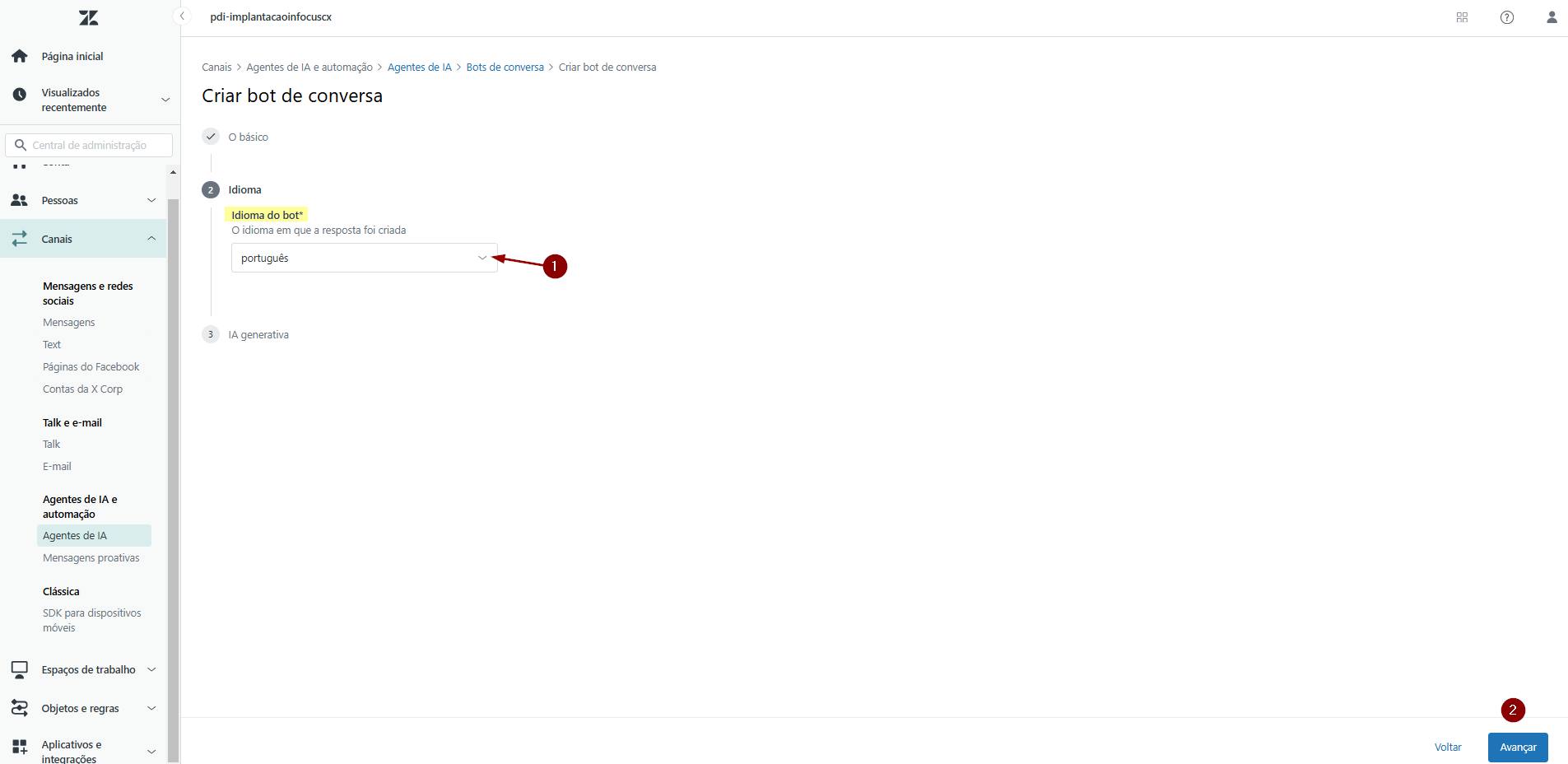7) Defina o idioma do bot. Clique na seta (1) para exibir a lista com as opções de idioma. Após a escolha, clique em Avançar (2).