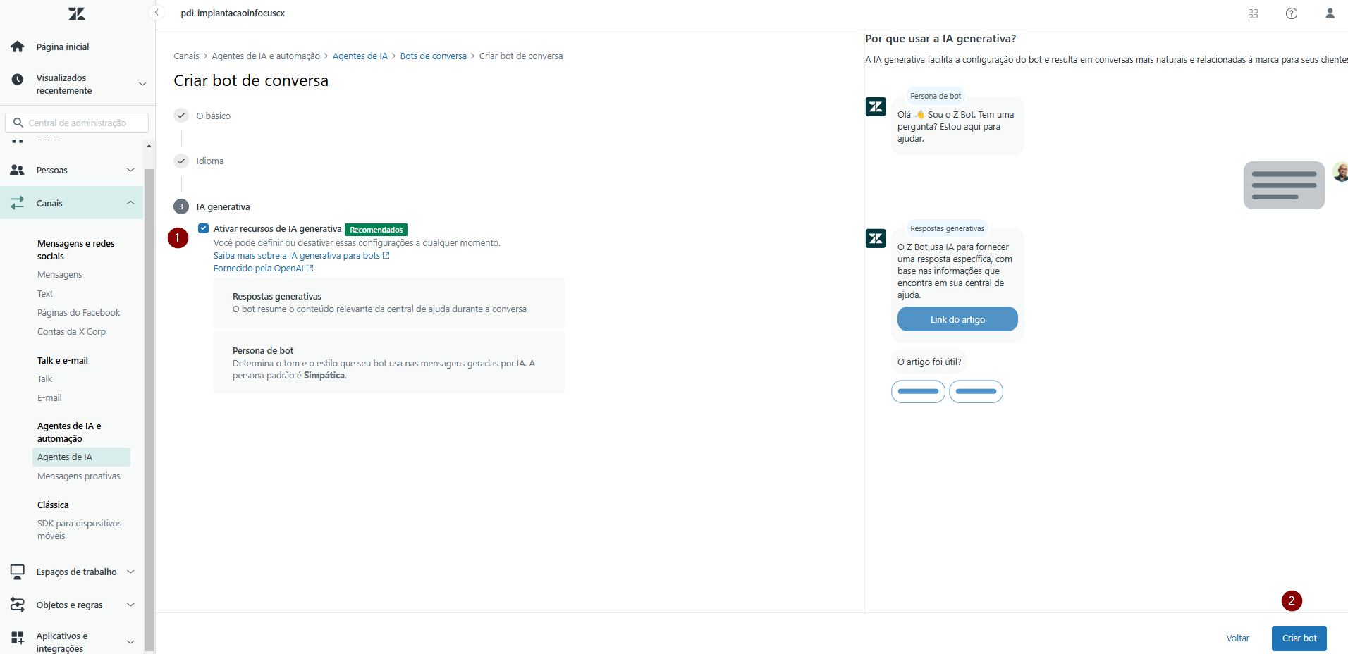 8) Caso deseje ativar os recursos de IA generativa, clique na respectiva caixa de seleção (1). Depois, clique em Criar bot (2).
