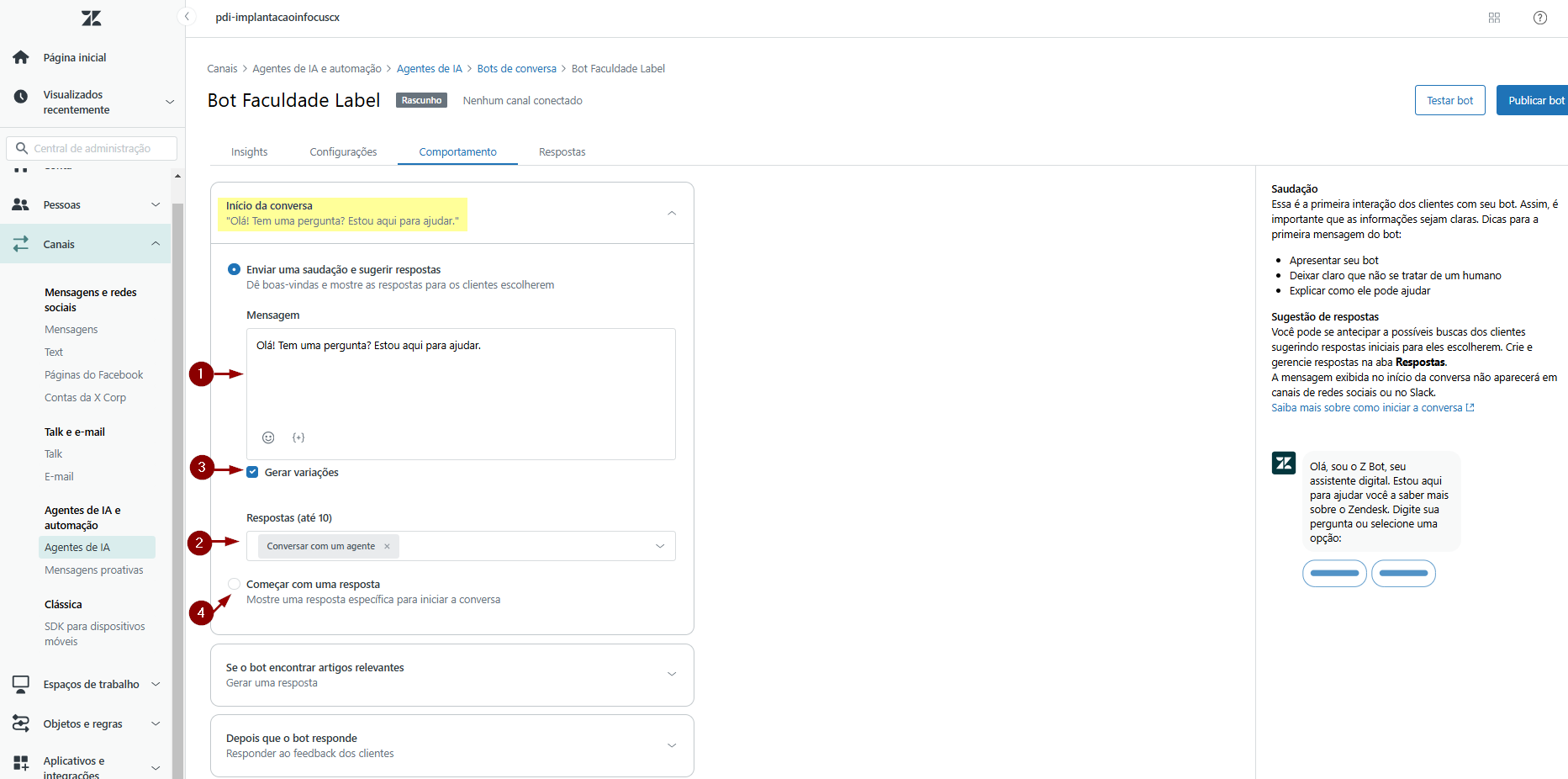 9) Na aba Comportamento será configurado o Início da Conversa. Defina a mensagem de saudação (1), e a especificação de até 10 opções de respostas (2) que serão exibidas ao usuário final assim que o chat for iniciado. Caso deseje que essa mensagem seja dinâmica, ative a opção Gerar variações (3). Se desejar exibir uma resposta específica para iniciar a conversa, ative a opção Começar com uma resposta (4).