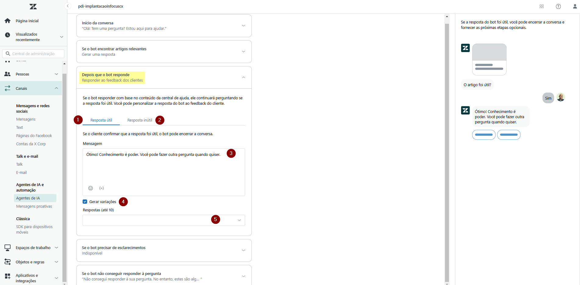 11) No bloco Depois que o bot responde, será definida a mensagem do bot ao cliente diante da recomendação de artigos. Após a recomendação, o bot irá perguntar ao cliente se a resposta foi útil ou não. Clique em Resposta útil (1) para definir a mensagem (3) apresentada quando o cliente considerar o conteúdo assertivo, e em Resposta inútil (2) para quando o conteúdo sugerido não tiver contribuído. A mensagem também poderá ser dinâmica, e para isso ative a opção Gerar variações (4). Dessa forma, o cliente poderá sinalizar se o conteúdo foi útil ou não.