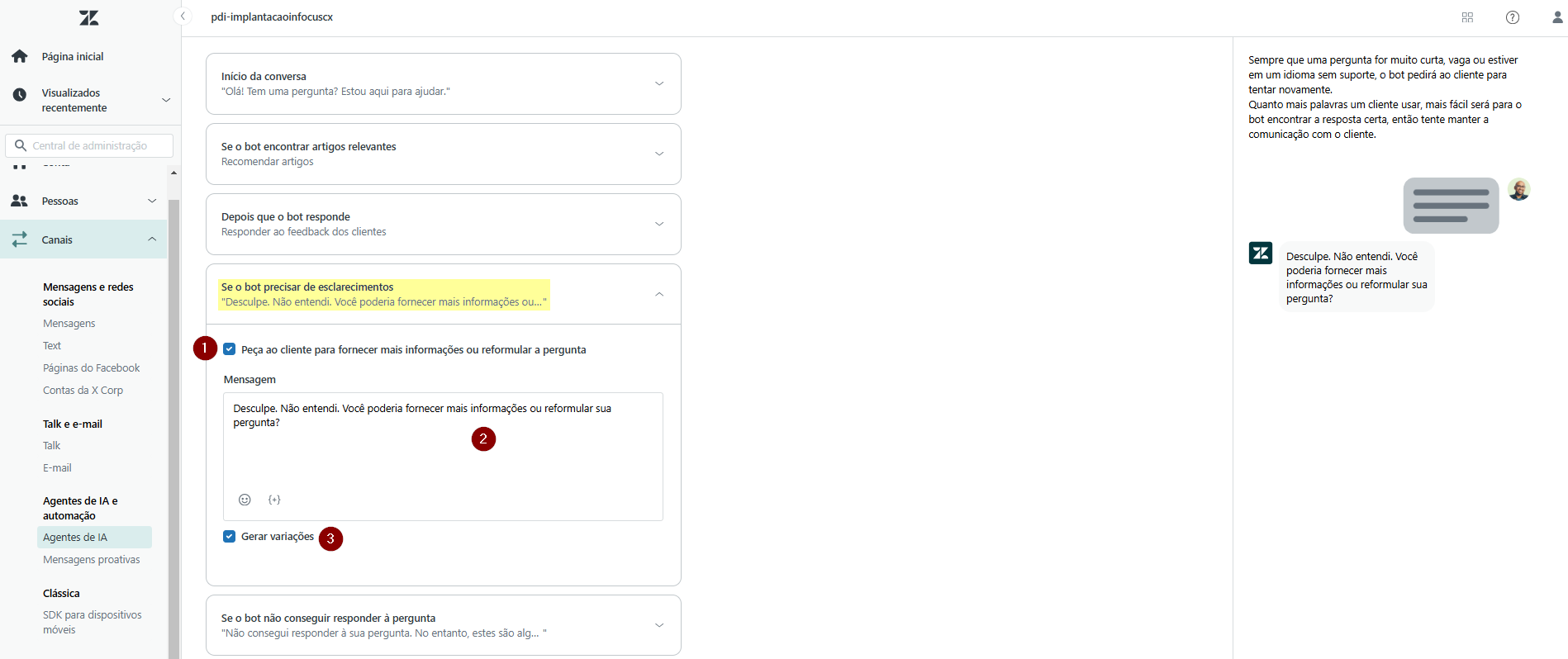12) No bloco Se o bot precisar de esclarecimentos, clique na caixa de seleção (1) para determinar a mensagem do bot ao solicitar mais informações ou reformulação da pergunta (2). Também será possível gerar variações (3). Essa bloco somente estará disponível para edição caso o bot tenha sido configurado para recomendar artigos ou não responder com base em artigos.