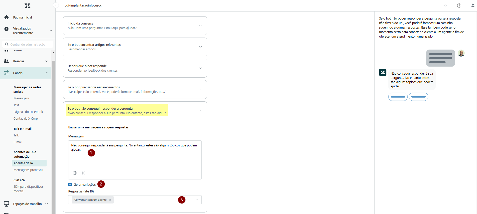 13) No bloco Se o bot não conseguir responder à pergunta, defina a mensagem (1) quando o bot não encontrar informações sobre a dúvida do cliente. Para mensagem com conteúdo dinâmico, ative Gerar variações (2). Caso desejado, configure até 10 opções de respostas (3) para exibição ao cliente.
