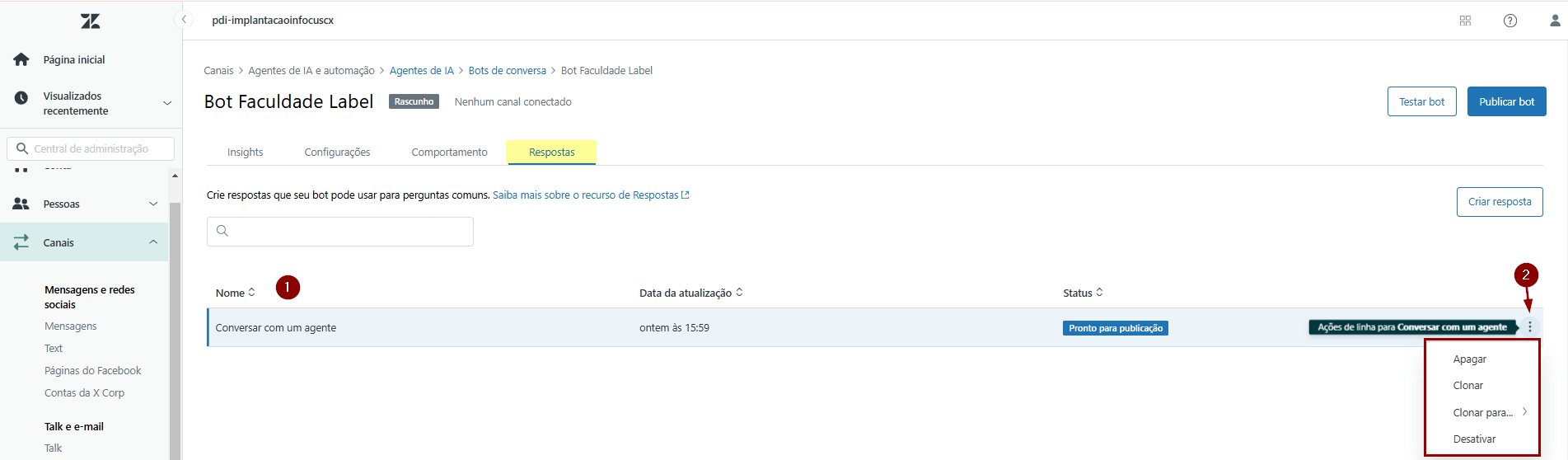 14) Na aba Respostas, crie as respostas conforme os serviços predefinidos na árvore de navegação definida para esse canal de atendimento. As respostas existentes (1) serão exibidas na tabela, com nome data de atualização e status. Posicione o cursor sobre os 3 pontinhos situados ao final da linha correspondente a cada resposta para exibir as ações de linha (2).