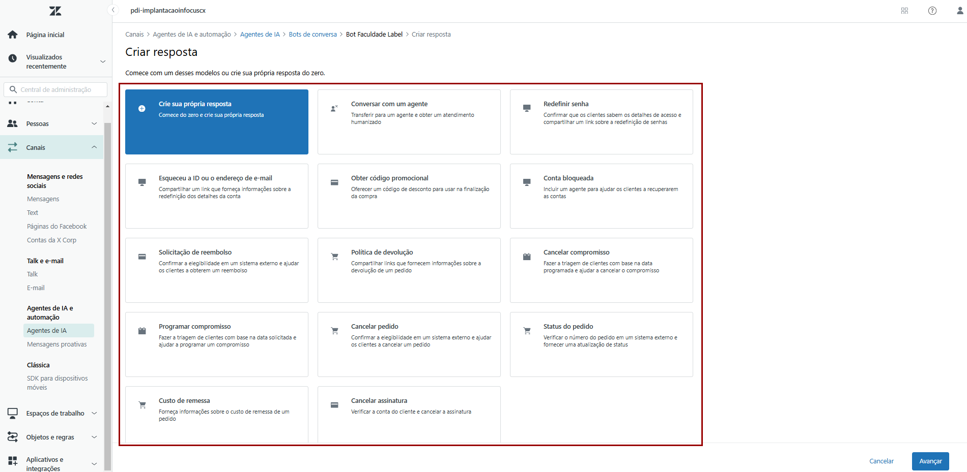 16) Selecione dentre os modelos disponíveis aqueles que melhor se adequam a cada pergunta, ou então Crie sua própria resposta selecionando essa opção. Clique em Avançar.
