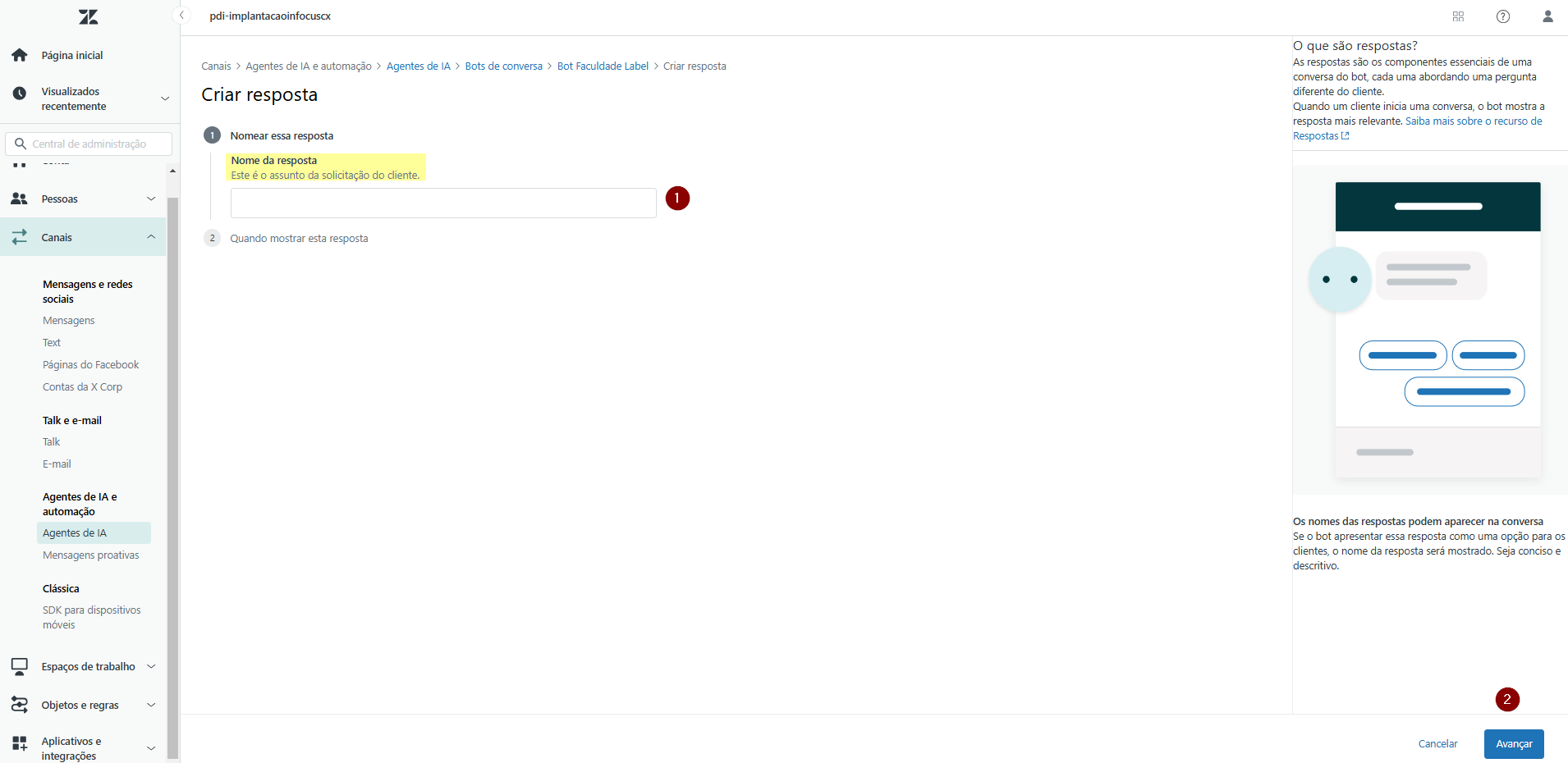 6) Defina o nome do bot (1), insira um Avatar (2) e selecione a qual marca (3) o bot estará vinculado. Clique em Avançar (4).