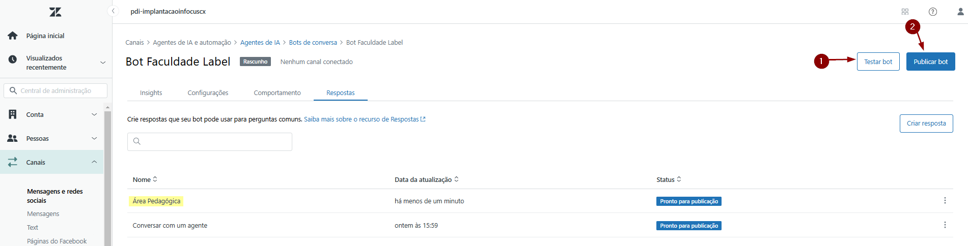 22) À medida em que cada resposta é formatada, elas serão listadas na aba Respostas. Clique em Testar bot para simular o fluxo em cada uma das opções e promover os ajustes finais (caso necessário). Assim que o bot estiver pronto para uso, basta clicar em Publicar bot (2).