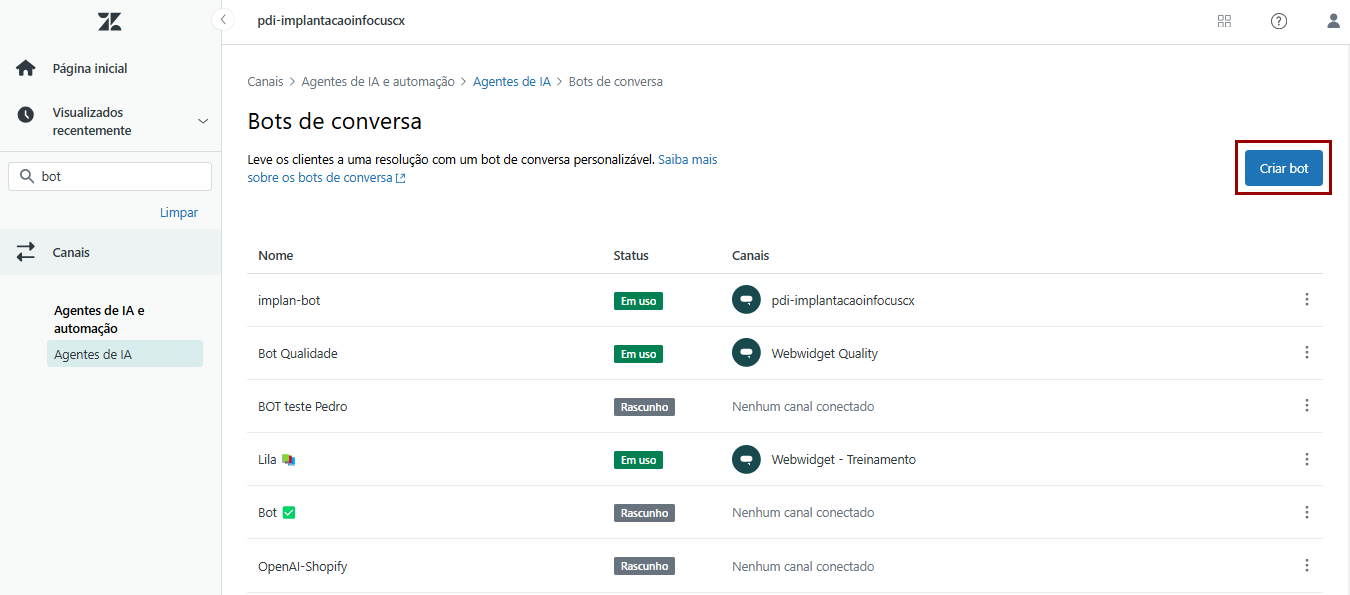 5) Caso existam outros fluxos de conversa criados, eles serão exibidos nessa etapa conforme o nome, o status e o canal em que está conectado. Para dar início a um novo bot, clique em Criar bot.