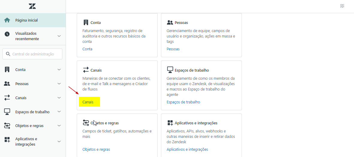 1) Inicialmente será necessário realizar o acesso à instância Zendesk da sua empresa, utilizando as credenciais de um administrador da conta. No menu de produtos Zendesk, clique em Central de Administração.