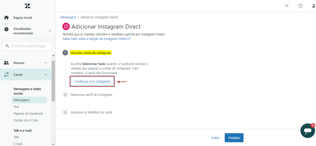 4) Em Adicionar Instagram Direct, na primeira etapa será necessário vincular a conta do Instagram. Clique em Continuar com Instagram.