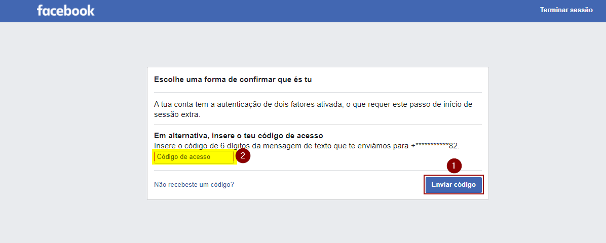 Insira o código recebido no campo Código de acesso e depois clique em Enviar Código.