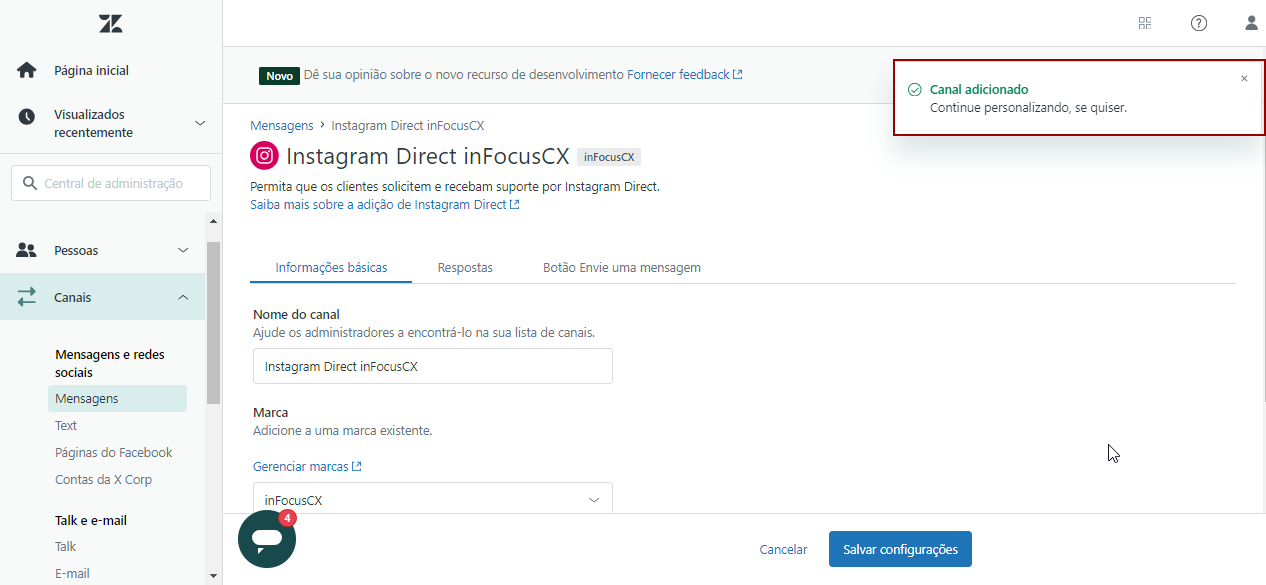 9) A Zendesk irá exibir a notificação confirmando a criação do canal.