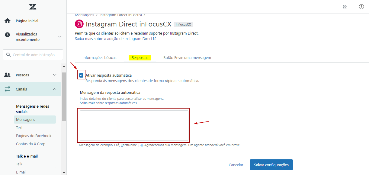 11) No menu Respostas, selecione o checkbox Ativar Resposta automática caso tenha interesse em configurar um texto personalizado, que será enviado ao cliente sempre que ele iniciar uma nova conversa com a sua marca.