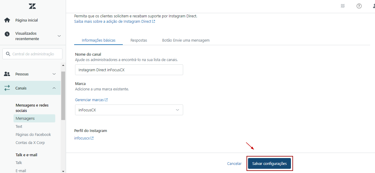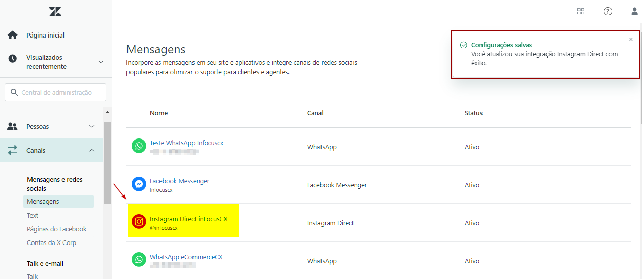 15) No canto superior da tela será exibida a confirmação de que as configurações foram salvas e que a integração do novo canal foi realizada com sucesso. O Instagram Direct já pode ser visualizado na lista de canais de contato habilitados em sua instância.