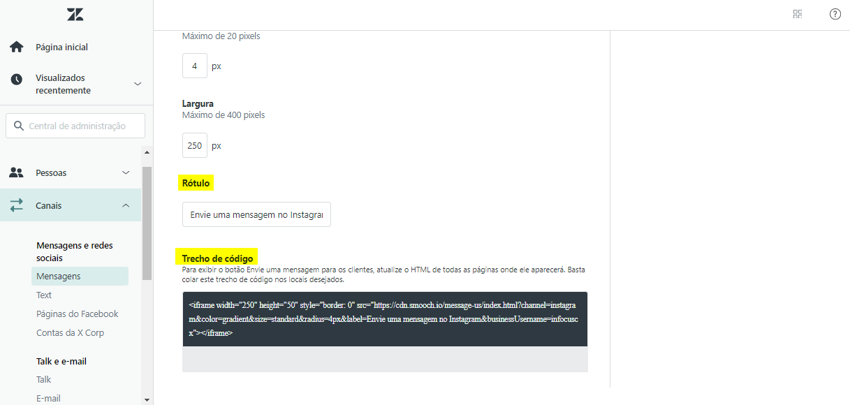 13) Ainda nesse menu, a opção Rótulo possibilita a personalização do texto exibido no botão. O Trecho código pode ser copiado para as páginas de interesse para que o botão seja exibido ao cliente nessas URLs também.