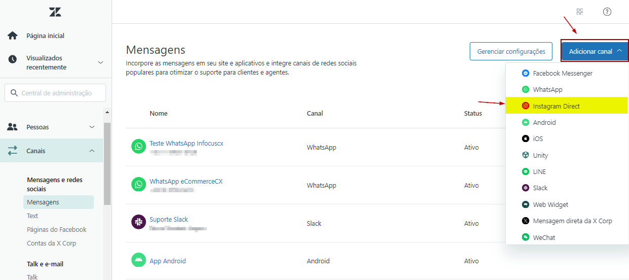 3) Clique no botão Adicionar Canal, e depois em Instagram Direct.