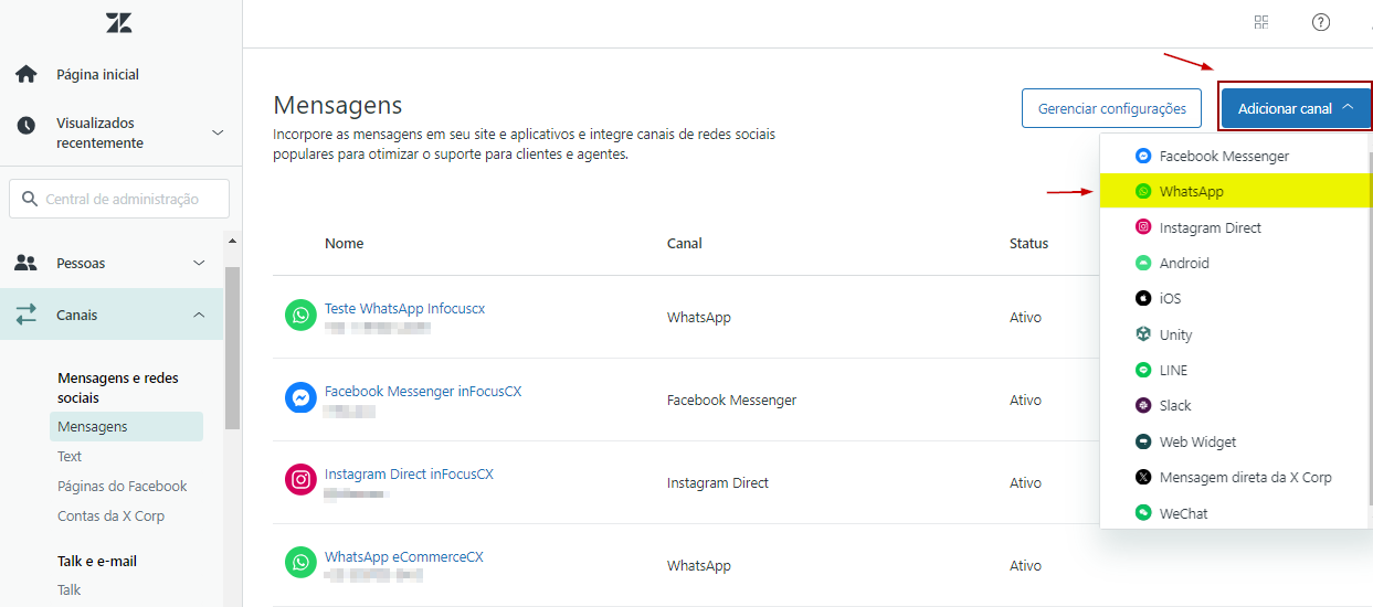 3) Clique no botão Adicionar Canal, e depois em WhatsApp.