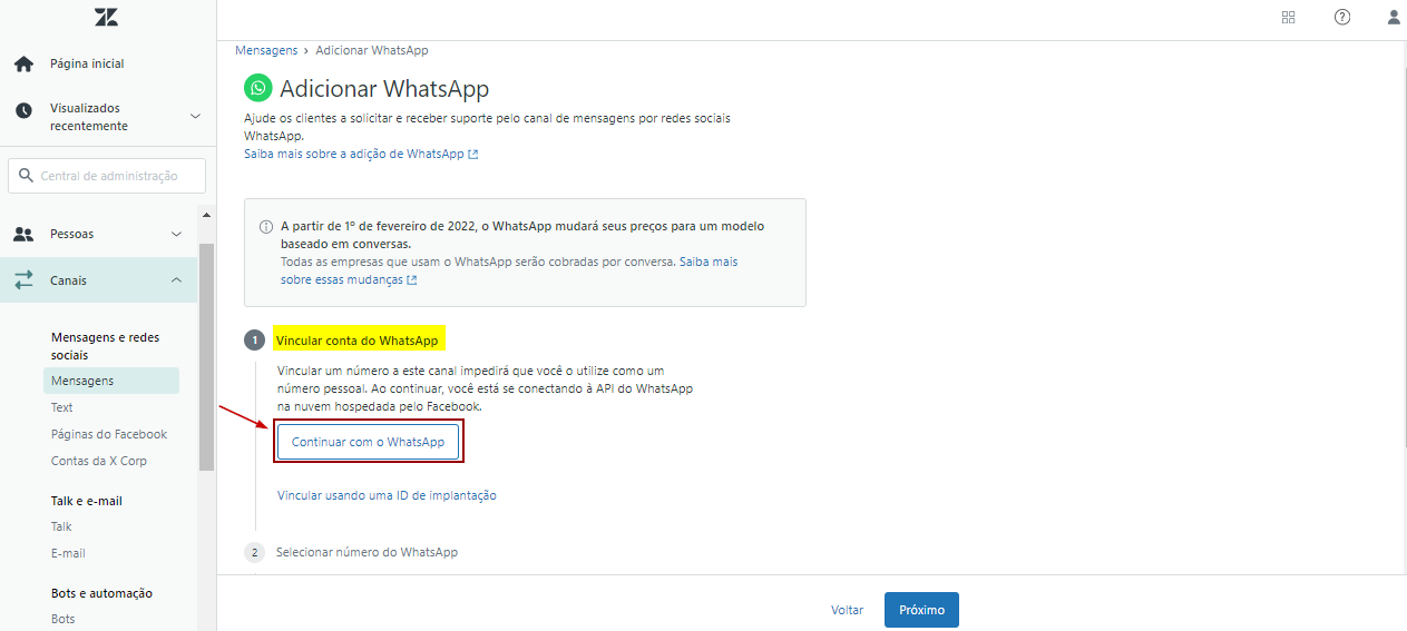 4) Em Adicionar WhatsApp, a primeira etapa consistirá em vincular a conta do Facebook. Clique em Continuar com o WhatsApp.