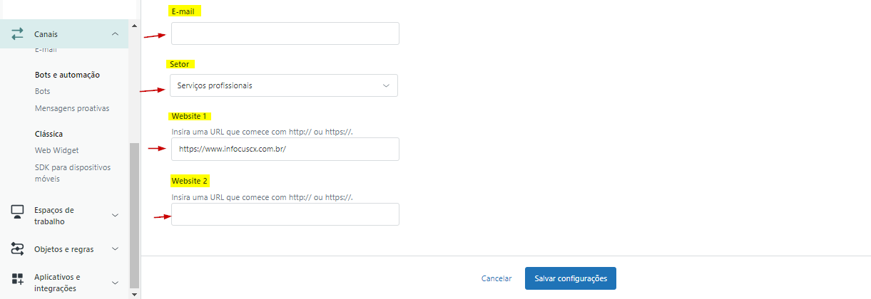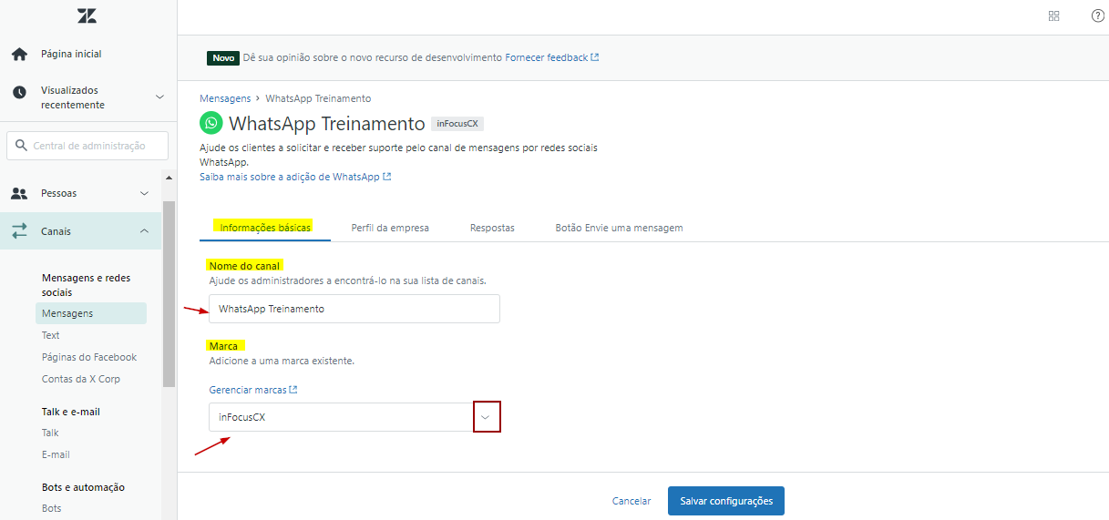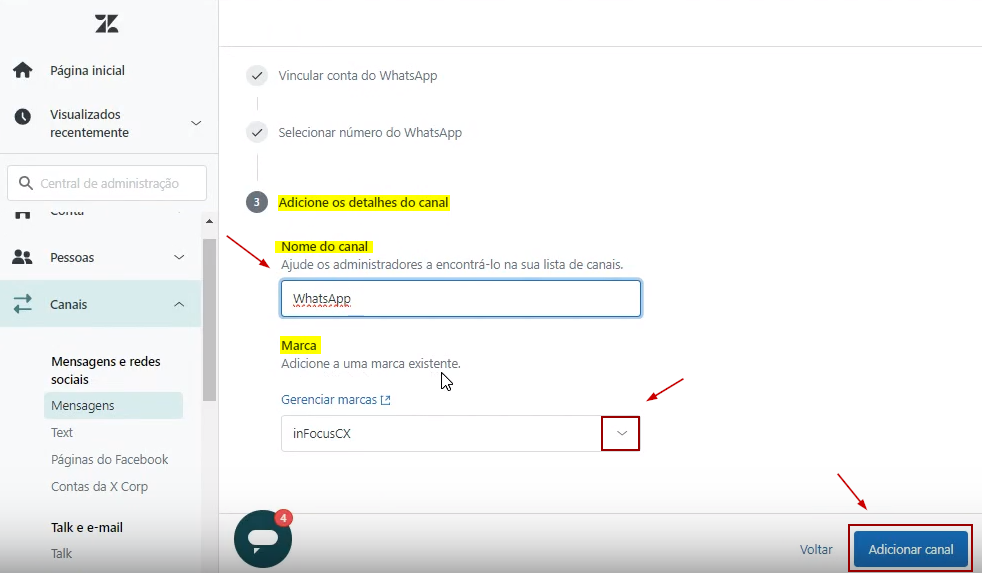 21) O próximo passo será adicionar os detalhes ao canal. Informe o nome desejado e, caso na instância da sua empresa existam multi marcas, clique na seta para selecionar a qual marca o canal de contato será vinculado. Clique em Adicionar Canal.