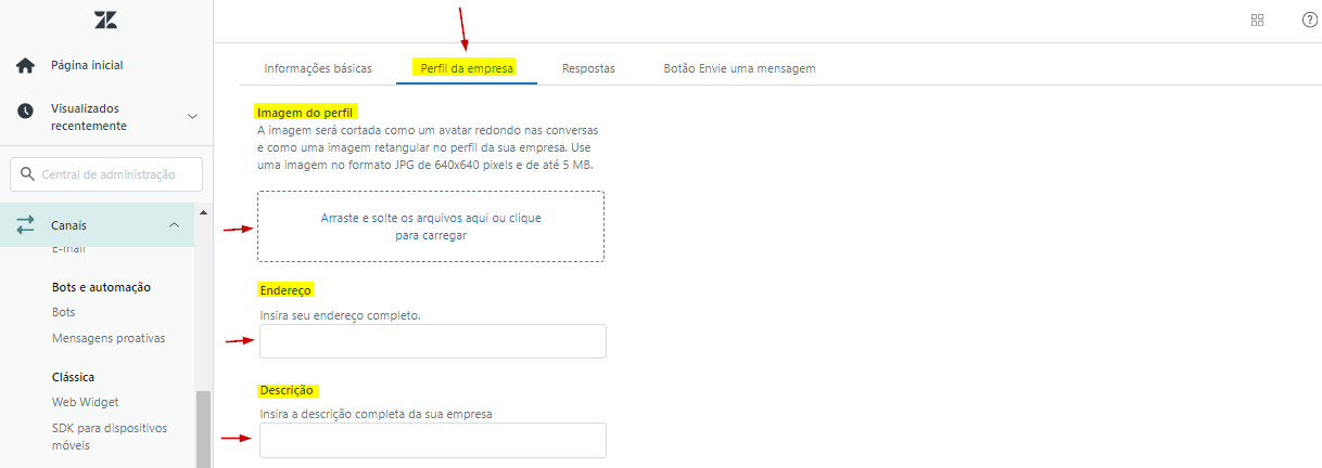 23) Em Perfil da empresa será realizado o upload do logo, a inserção do endereço completo, da descrição do negócio, e-mail de contato, setor e website.