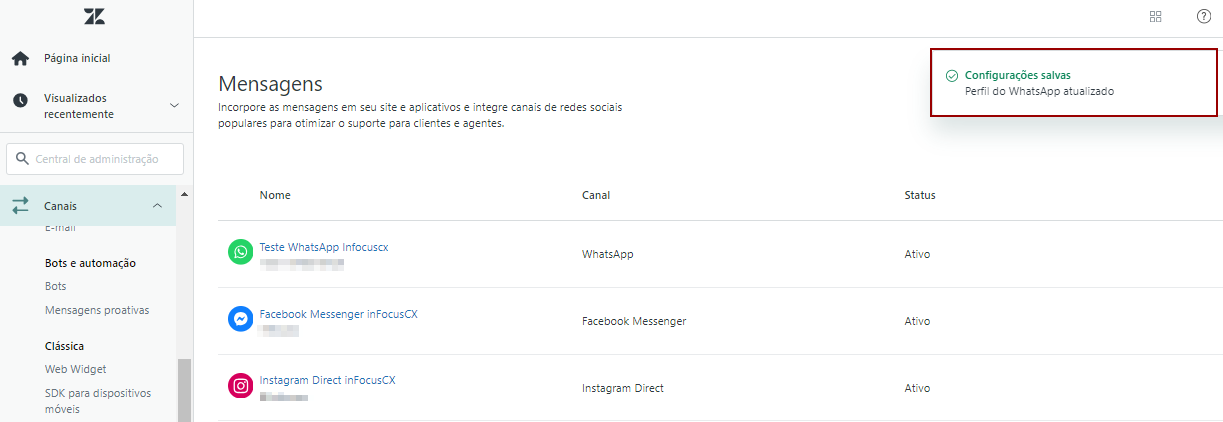 28) No canto superior da tela, será exibida a confirmação de que as configurações foram salvas e que a integração do novo canal foi realizada com sucesso. O WhatsApp Business já pode ser visualizado na lista de canais de contato habilitados em sua instância.