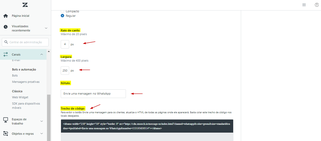26) Ainda nesse menu, a opção Rótulo possibilita a personalização do texto exibido no botão. O Trecho código pode ser copiado para as páginas de interesse para que o botão seja exibido ao cliente nessas URLs também.