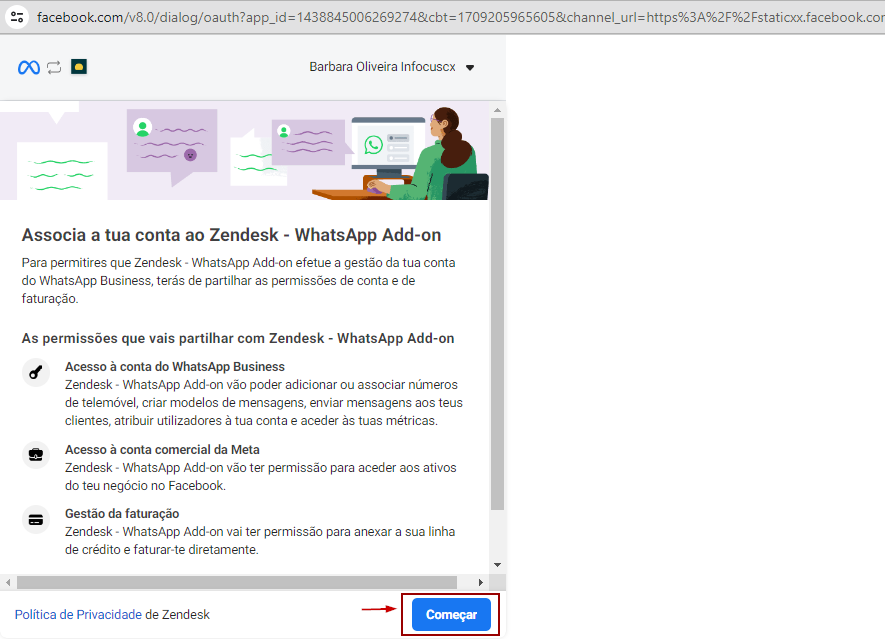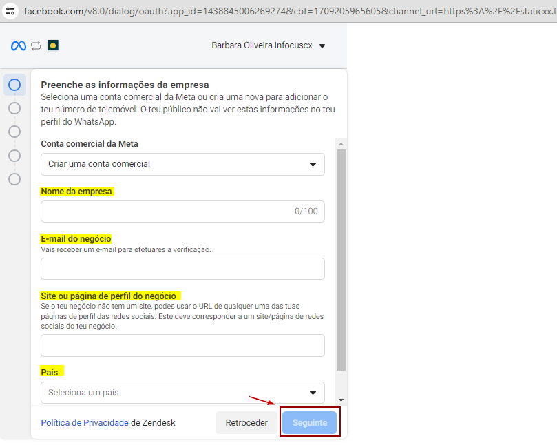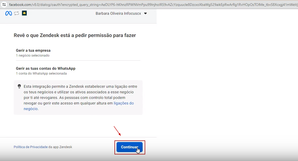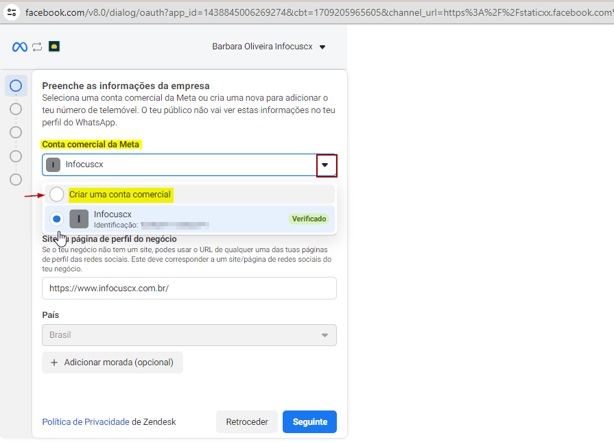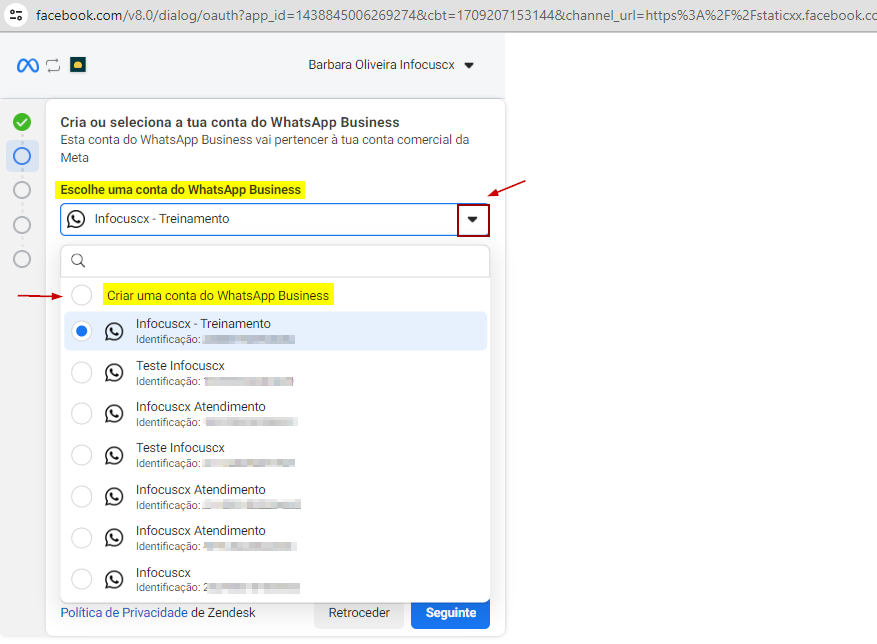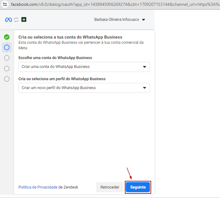 12) Em Escolhe uma conta do WhatsApp Business, selecione uma conta existente, ou então clique Criar uma conta do WhatsApp Business para criar uma nova.