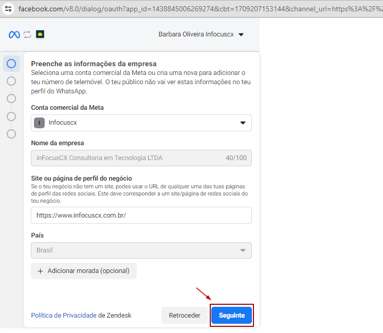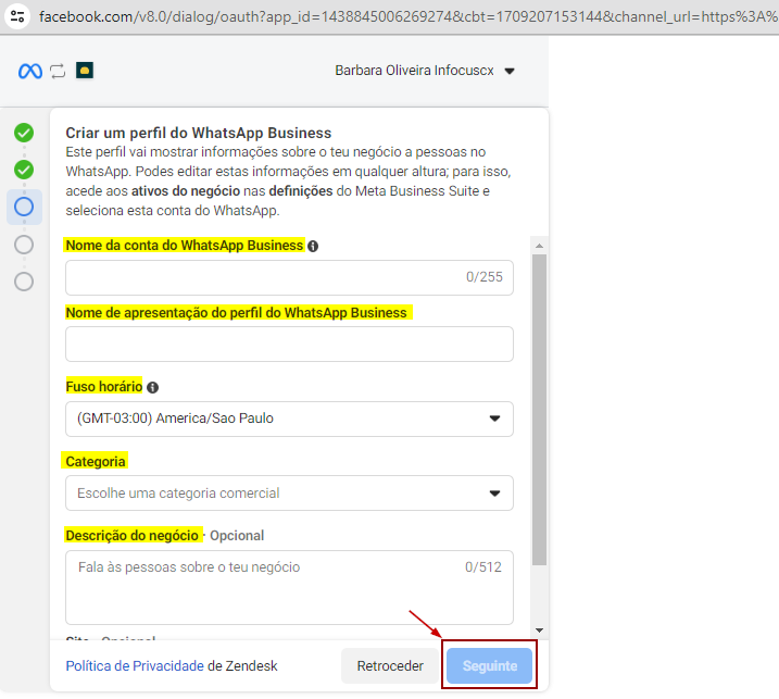 14) Serão definidos o nome da conta do WhatsApp Business, o nome de apresentação do perfil, o fuso horário, a categoria, a descrição do negócio (opcional) e o site (opcional). Clique em Seguinte.