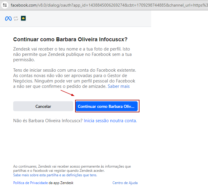 7) Clique em Continuar como para acessar o perfil pessoal do usuário com permissão total na página do Facebook Business da empresa.