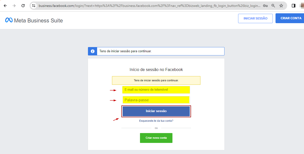 2) Inicie a sessão inserindo as credenciais (login e senha) do perfil pessoal do usuário que possui permissão total na página do Facebook Business da empresa.