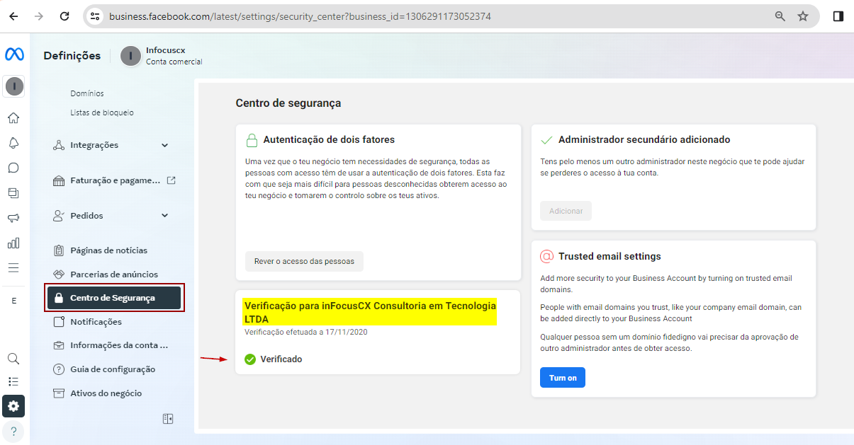 5) Em Centro de Segurança será possível confirmar se o status da página da empresa está verificado.