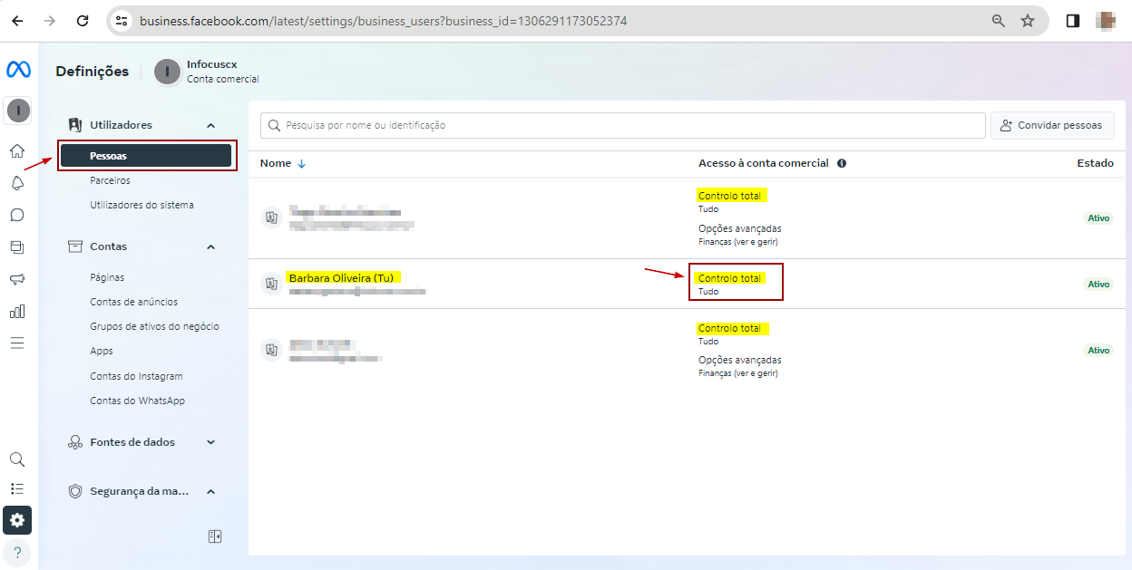 4) Em Definições do negócio, destacamos o menu Pessoas. Nessa opção será possível confirmar se o usuário utilizado para acessar a página da empresa no Facebook é um administrador da empresa, com permissão total. O perfil utilizado precisa ter acesso à página com permissão total.