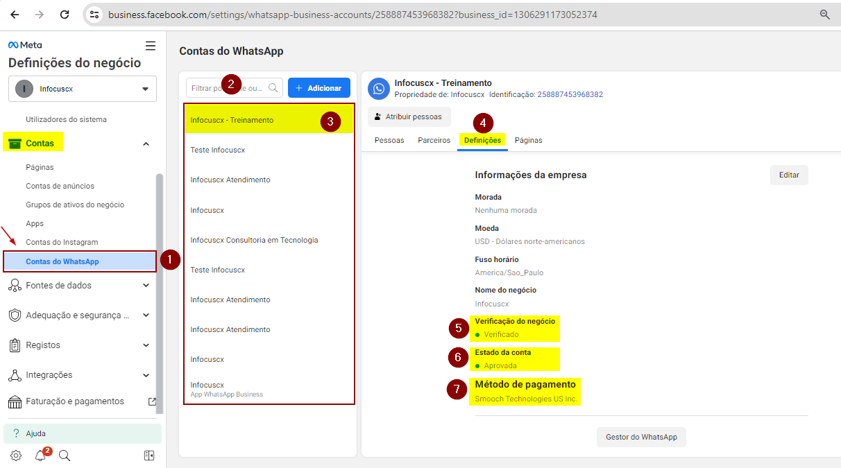 ⚠️Para que a configuração do novo canal de contato tenha sido concluído com sucesso, as definições da nova conta do WhatsApp Business precisam estar com as seguintes condições (5, 6 e 7):
