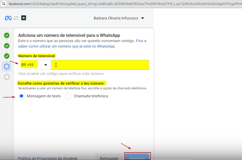 15) Informe agora o número de telefone do novo WhatsApp Business da empresa, com o DDD e o código internacional do País. Selecione também o método desejado para verificação do número.