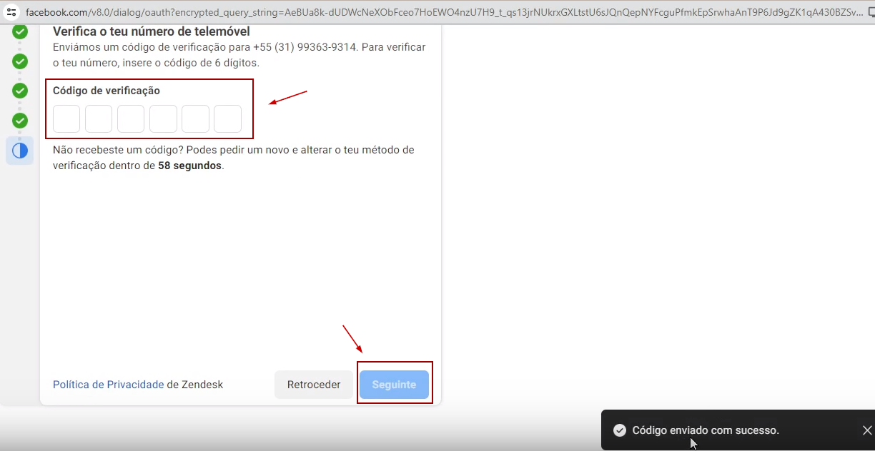 6) Na etapa de autenticação de dois fatores, o Facebook Business irá enviar um código por SMS para o número telefone cadastrado na credencial utilizada.