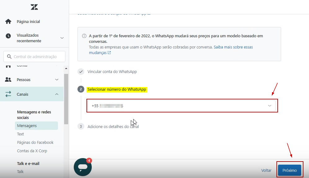 20) Após a criação da conta e identificação do número, será iniciada a etapa seguinte já na instância da Zendesk. Observe que o número cadastrado já consta na opção Seleção do número de WhatsApp. Clique na seta para selecionar o número cadastrado, e clique em Próximo.