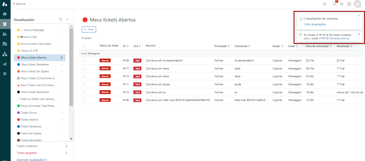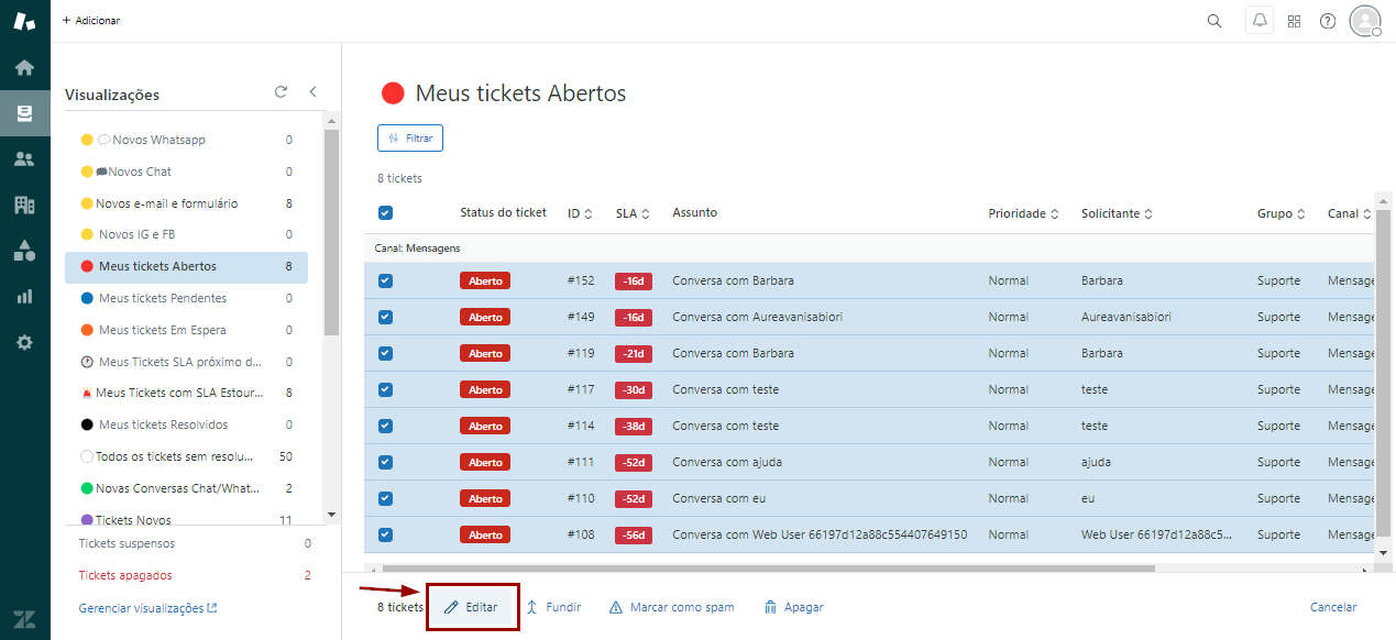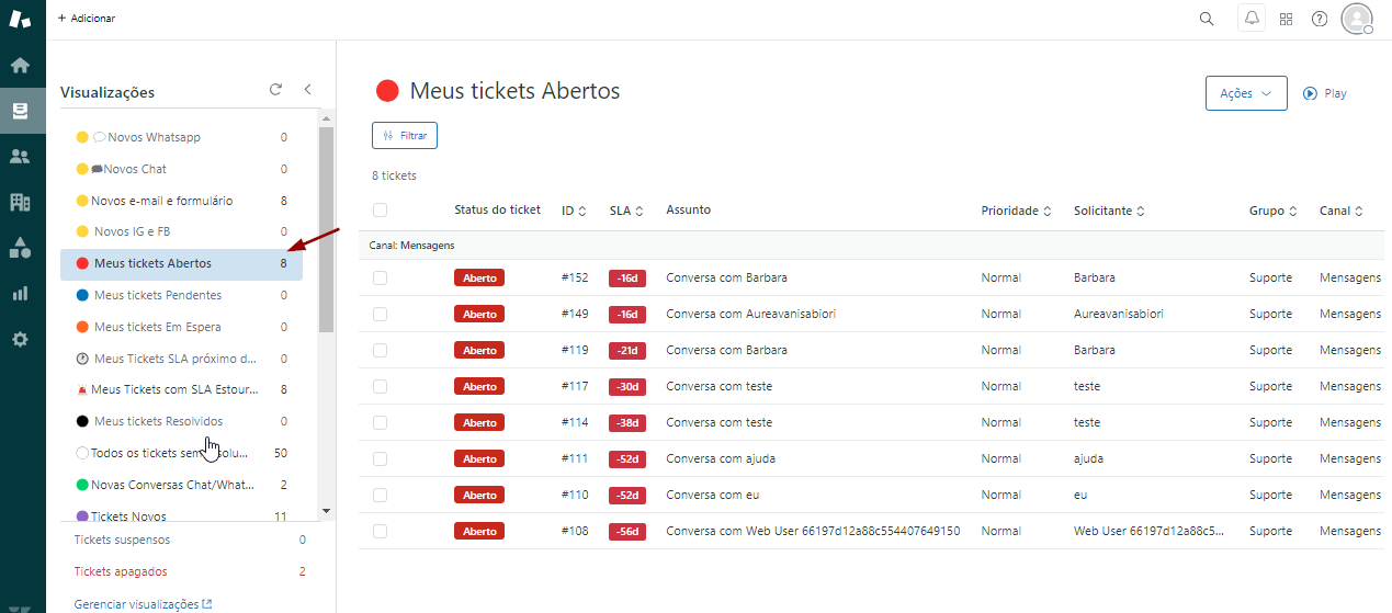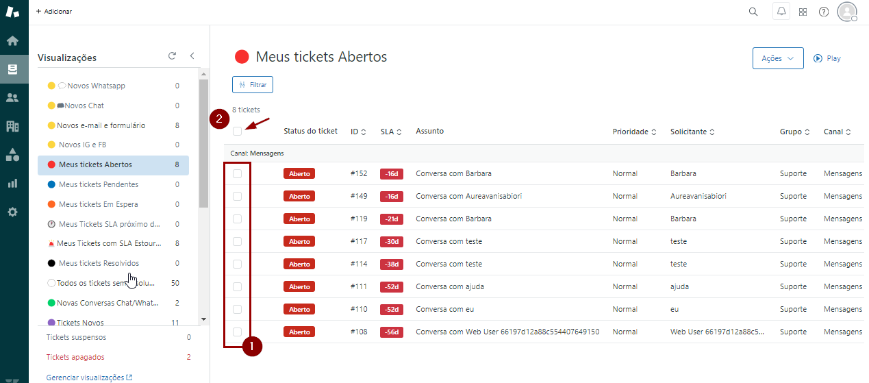 1) O gerenciamento em massa pode ser feito em qualquer visualização que possua tickets. Por isso, inicialmente clique na visualização de interesse para que seus tickets sejam exibidos.