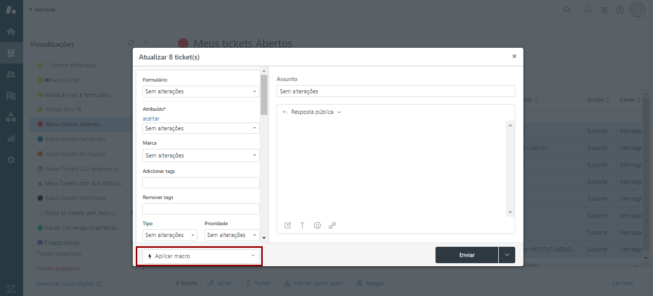 6) Você também pode aplicar uma macro a todos os tickets selecionando-a no menu Aplicar macro.
