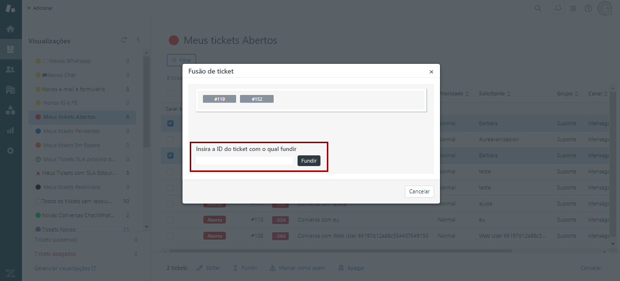 3) Será exibida uma caixa de diálogo com a identificação Fusão de ticket. Na lacuna correspondente digite a ID do ticket com o qual os tickets selecionados serão unificados, e clique em Fundir.