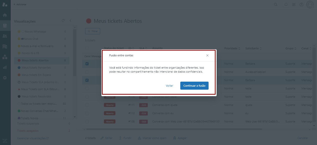 4) Será exibida um alerta caso o processo de fusão envolva tickets de organização, marca ou solicitante diferentes. Certifique-se se informações confidenciais não estão sendo compartilhadas sem querer no processo de fusão. Para finalizar o comando, clique em Continuar a fusão.
