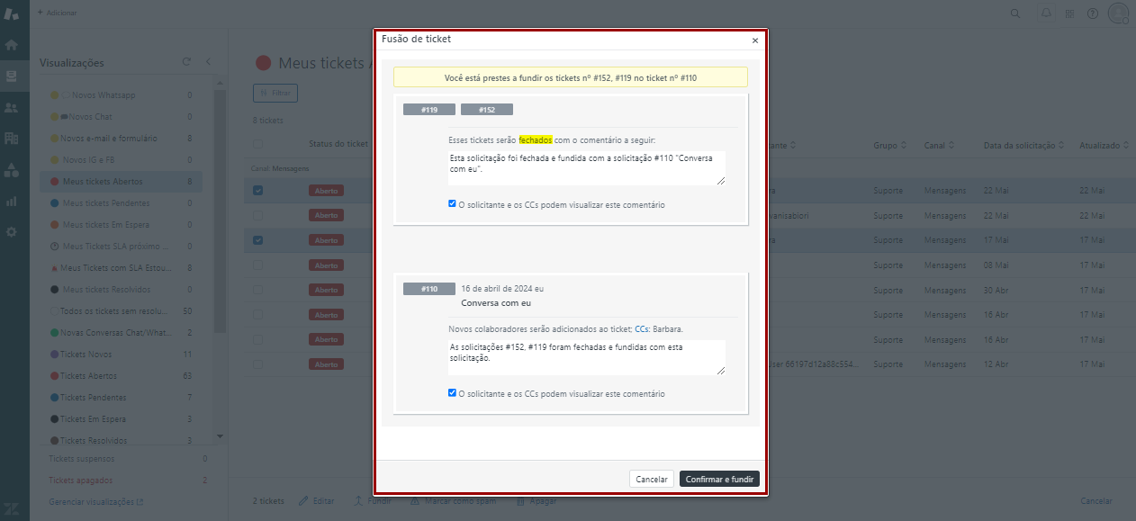 5) Uma nova janela Fusão de Tickets será exibida para a confirmação da ação. É importante termos clareza de que, em um processo de fusão, parte dos tickets serão fechados e apenas um permanecerá disponível interação.