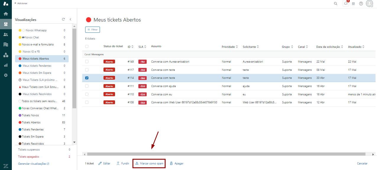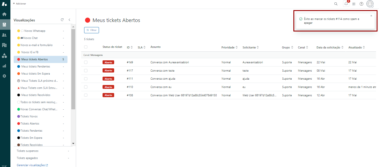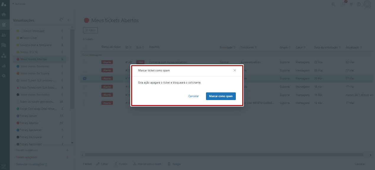 🔔Os tickets marcados como spam são movidos para a visualização Tickets apagados e os solicitantes são suspensos ao mesmo tempo. É possível retirar a suspensão dos usuários suspensos, se necessário.