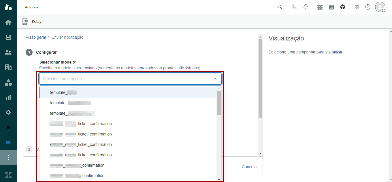 6) Em Configurar, selecione o modelo de template a ser utilizado. A lista contempla apenas os modelos aprovados.