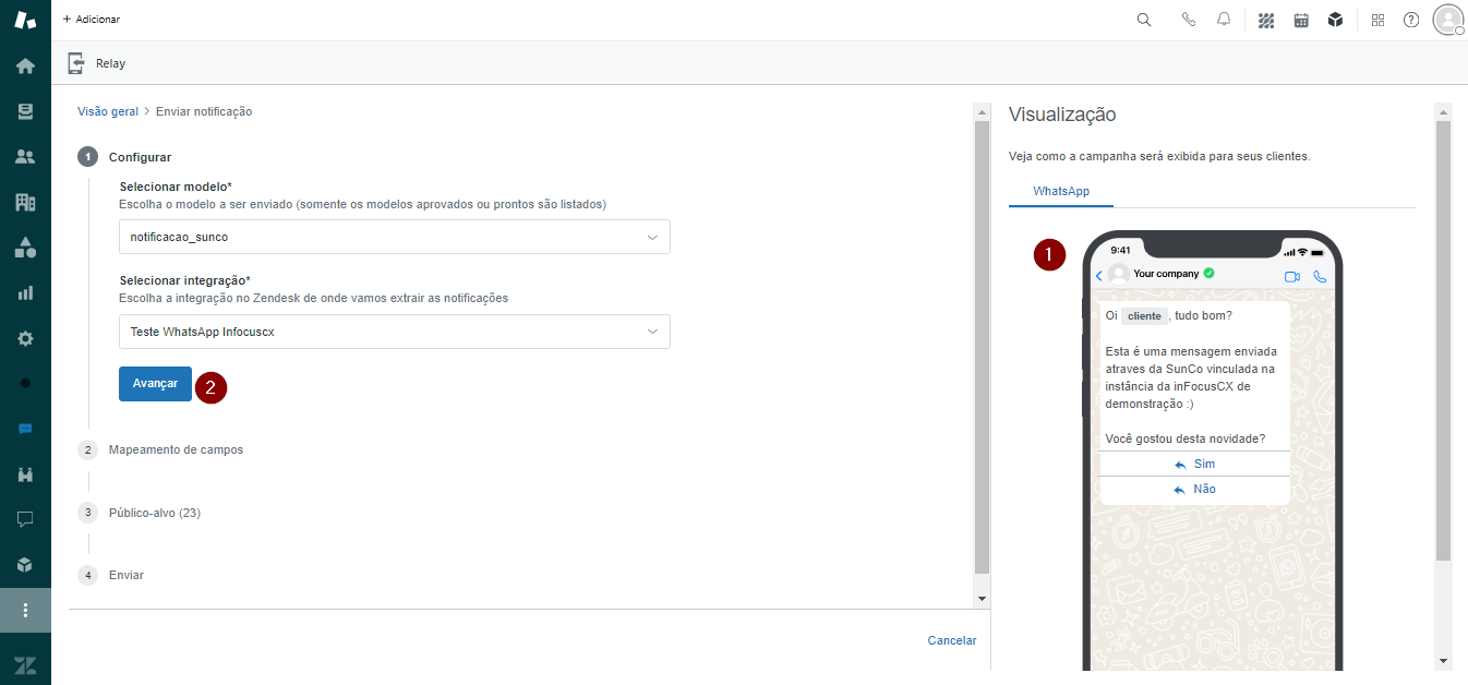 8) Na lateral da tela será possível visualizar como o conteúdo do template será apresentado ao cliente (1). Clique em Avançar (2).