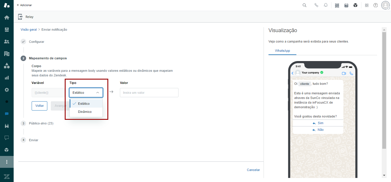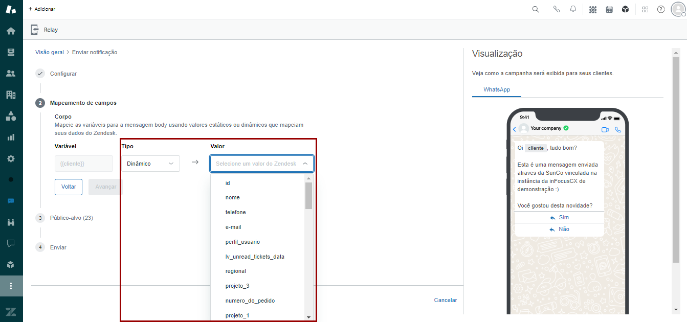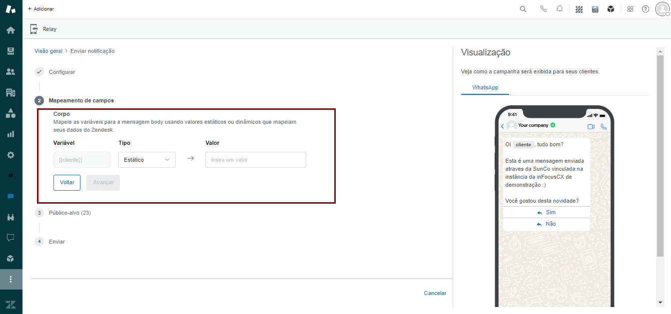 9) Caso o Relay identifique a presença de variáveis no template, em Mapeamento de Campos será exibida a etapa corpo. Nesse bloco serão estabelecidos os valores em cada variável, considerando o contexto de cada cliente a ser impactado no disparo. Para cada variável, indique o tipo e o respectivo valor.